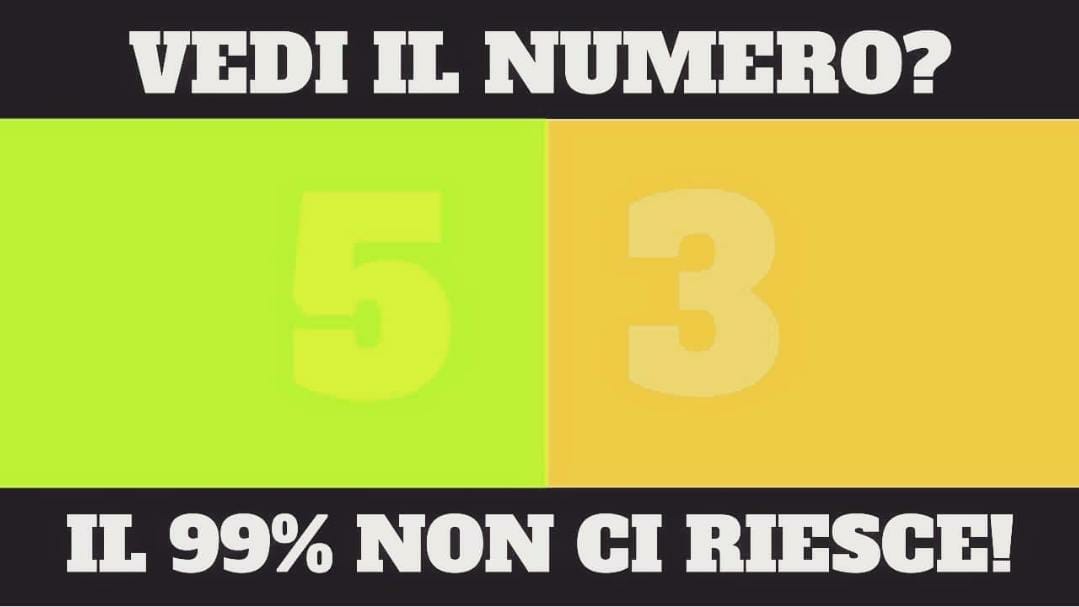 Probabilmente l’immagine ad una tale saturazione e nitidezza rende l’impresa assai difficile ma se vi impegnate bene potrete scorgere due numeri all’interno dei due rettangoli colorati. I numeri nascosti sono il 5 ed il 3. Non ci credete? Se proprio non riuscite a vederli provate a salvarvi la prima immagine ed a modificarne luminosità e nitidezza, oppure guardate quella che abbiamo creato per voi scorrendo e scoprendo la soluzione.