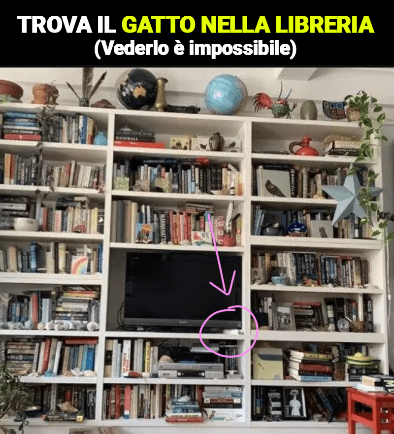 Bentornati su Aforismi.it la testa di fiducia per tutti quelli che amano mettere alla prova le loro abilità, divertendosi con qui, indovinelli ed enigmi di vario genere. Se siete pronti per la sfida di oggi vi presentiamo il test visivo in questione. Nell’immagine è presente una libreria piena zeppa di libri, riesci a trovare il gattino nascosto?