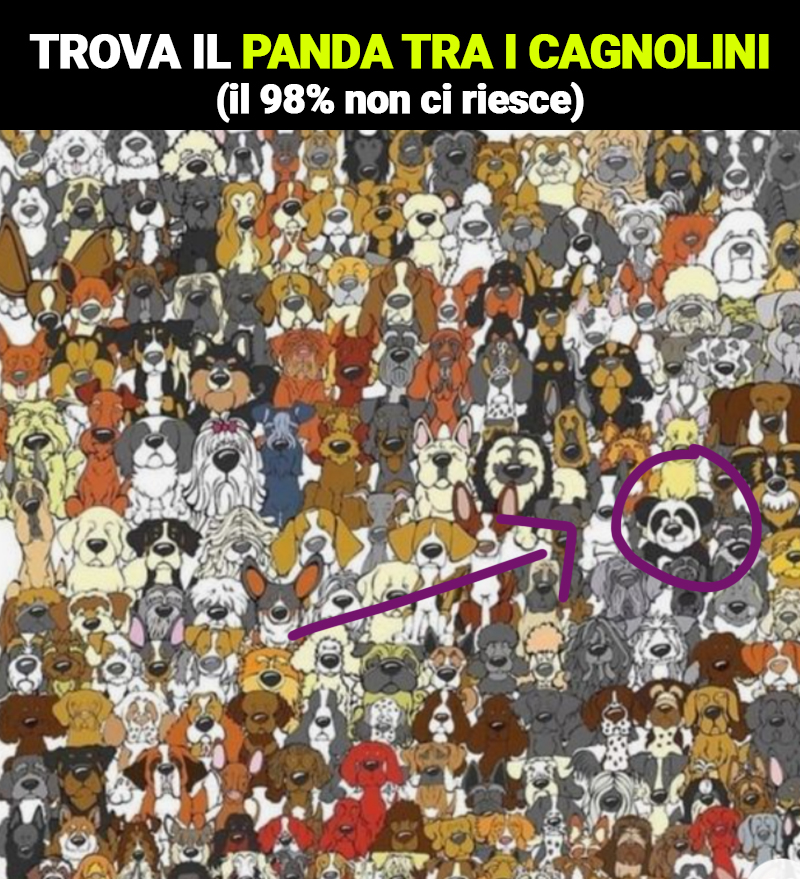 Benvenuti su Aforismi.it la vostra pagina principalmente di stampo culturale ma dove potete trovare anche quiz, test ed indovinelli per tutti i gusti. Il test visivo di oggi è composto da un gruppo di cagnolini delle più svariate razze e colori. Riesci a trovare il panda nascosto tra questi nell’immagine?