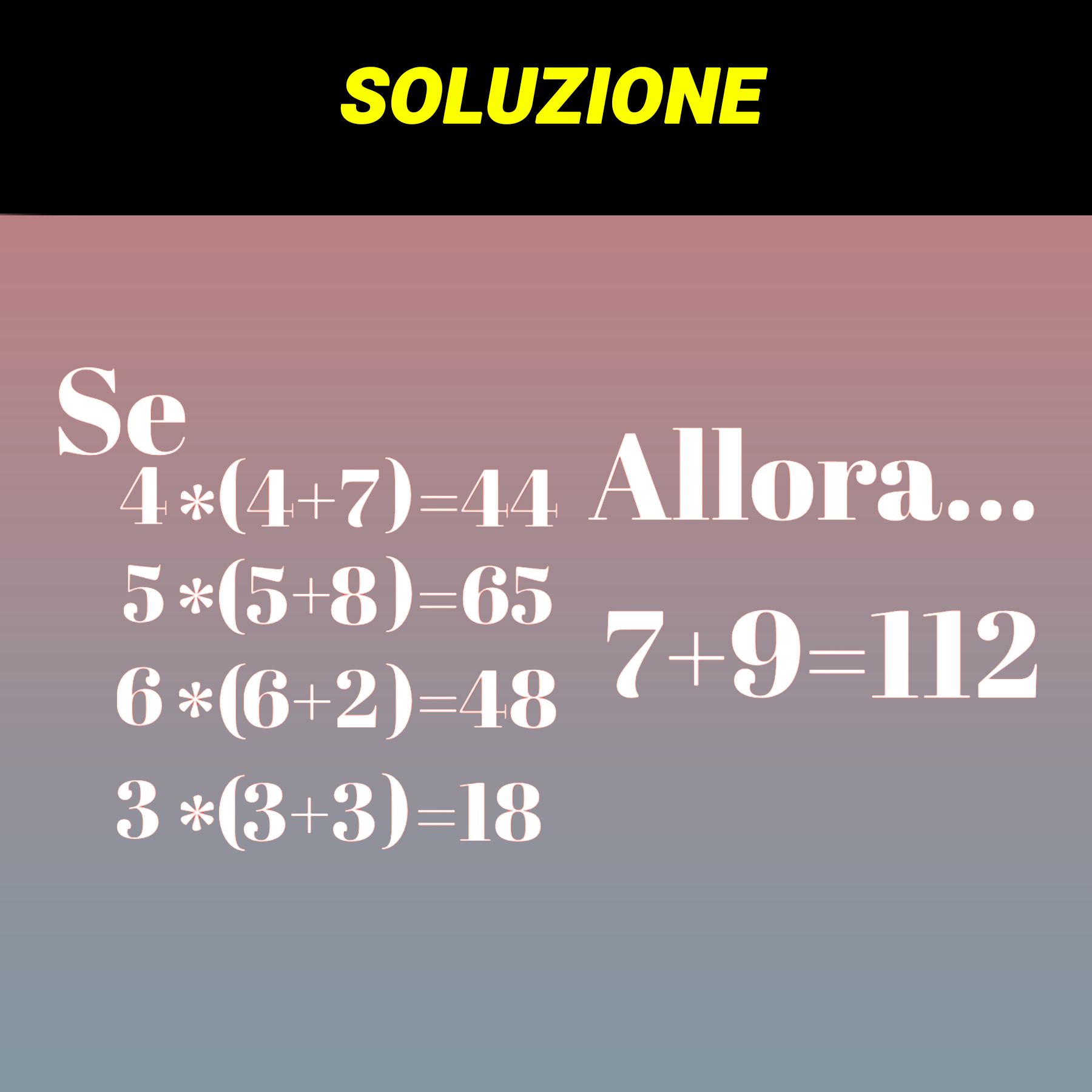 Considerando i valori presenti, da piccole somme risultano numeri assai grandi. Di conseguenza possiamo dedurre che c’è un valore mancante, considerato nel risultato ma assente nelle operazioni. Senza remore vi diciamo che si tratta di una moltiplicazione. Ma sta a voi scoprire che cosa dovete moltiplicare.