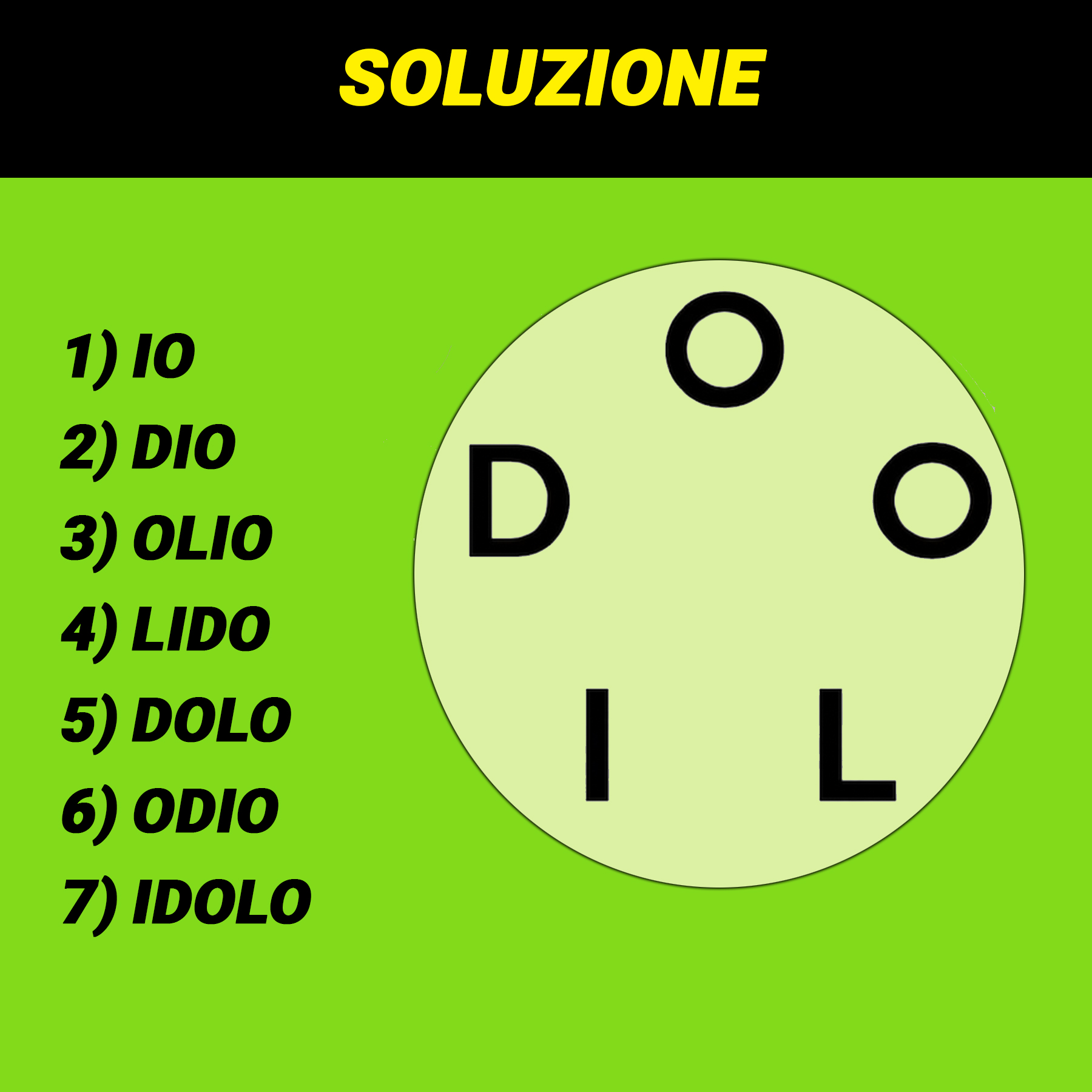 La più lunga delle parole misteriose è proprio “Idolo” che contiene tutte le lettere presenti nella plancia di gioco. Ne restano quattro di quattro lettere. Ma arrivati a questo punto ve ne sveliamo almeno due: olio e lido. Per scoprirle tutte ed avere un quadro generale della soluzione di questo enigma, date un’occhiata qui sotto.