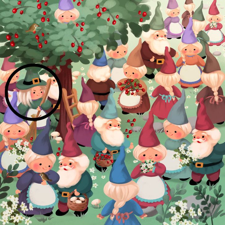 Nell’immagine di oggi è rappresentato un mondo incantato di gnomi che vivono in pace con la natura. Tuttavia, infiltrata nel raduno c’è una strega dall’espressione imbronciata. Riesci a vederla?