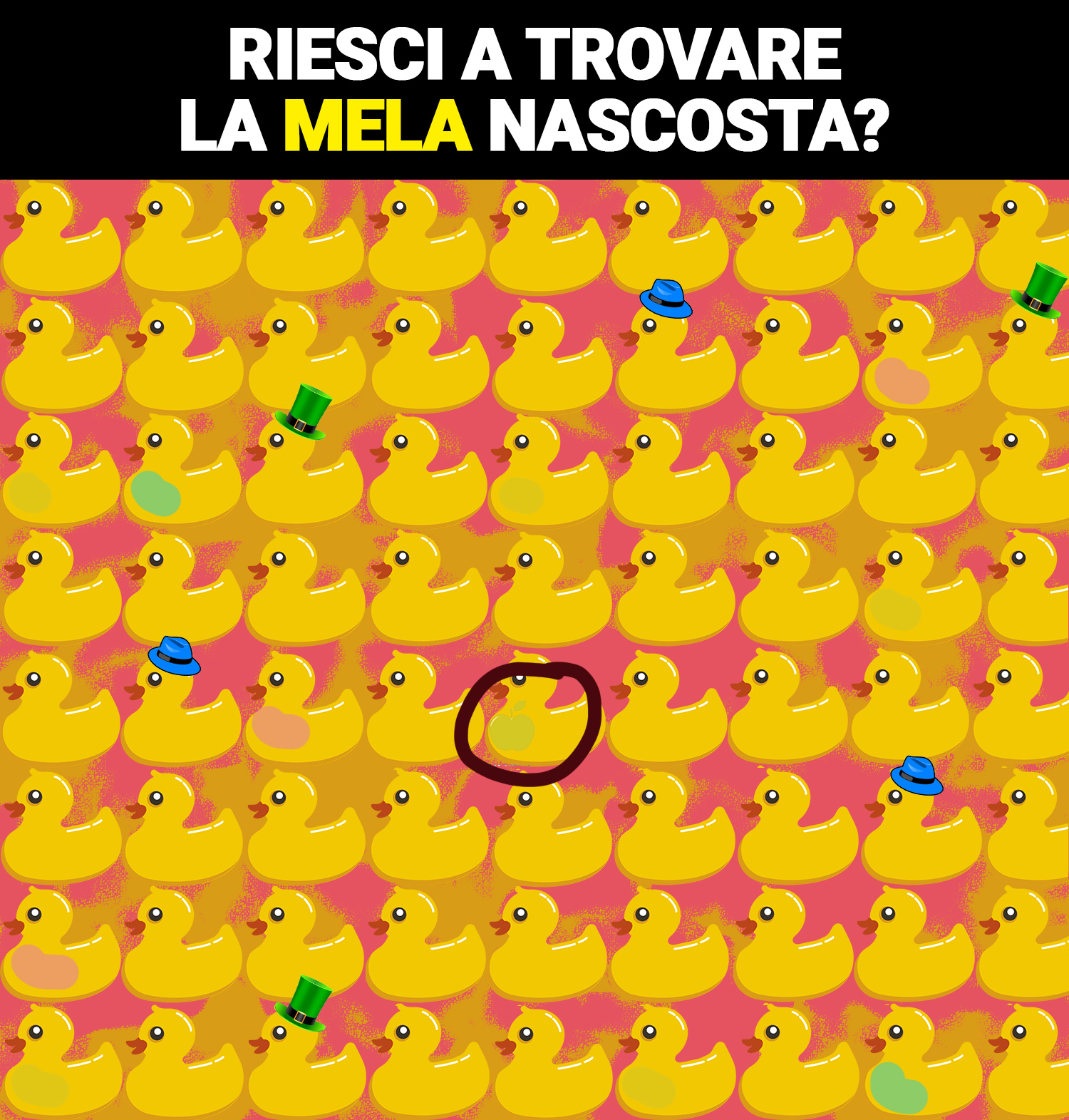 Bentornati sulla nostra pagina. Eccoci tornati con un nuovo quiz visivo del tutto inedito, creato ah hoc dalla nostra redazione per mettevi di buon umore ma anche alla prova. Quest’oggi un mare di paperelle gialle, addobbate di dettagli più o meno vistosi ha invaso lo sfondo. Questo gruppo numeroso di volatili c’è una succosa mela nascosta che aspetta solo di essere trovata. Riuscite a vederla?