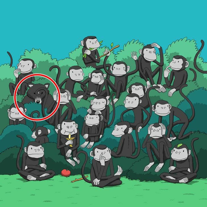 Benvenuti o bentornati sulla nostra pagina dove ogni giorno pubblichiamo quiz, test ed enigmi per tutti i gusti. Quello di oggi è un test visivo, un disegno super simpatico di alcune scimmie che sembrano messe in posa per una foto ricordo. C’è un’intruso che a primo sguardo risulta così coerente con l’immagine che i più non lo noteranno. Riesci a vederlo?