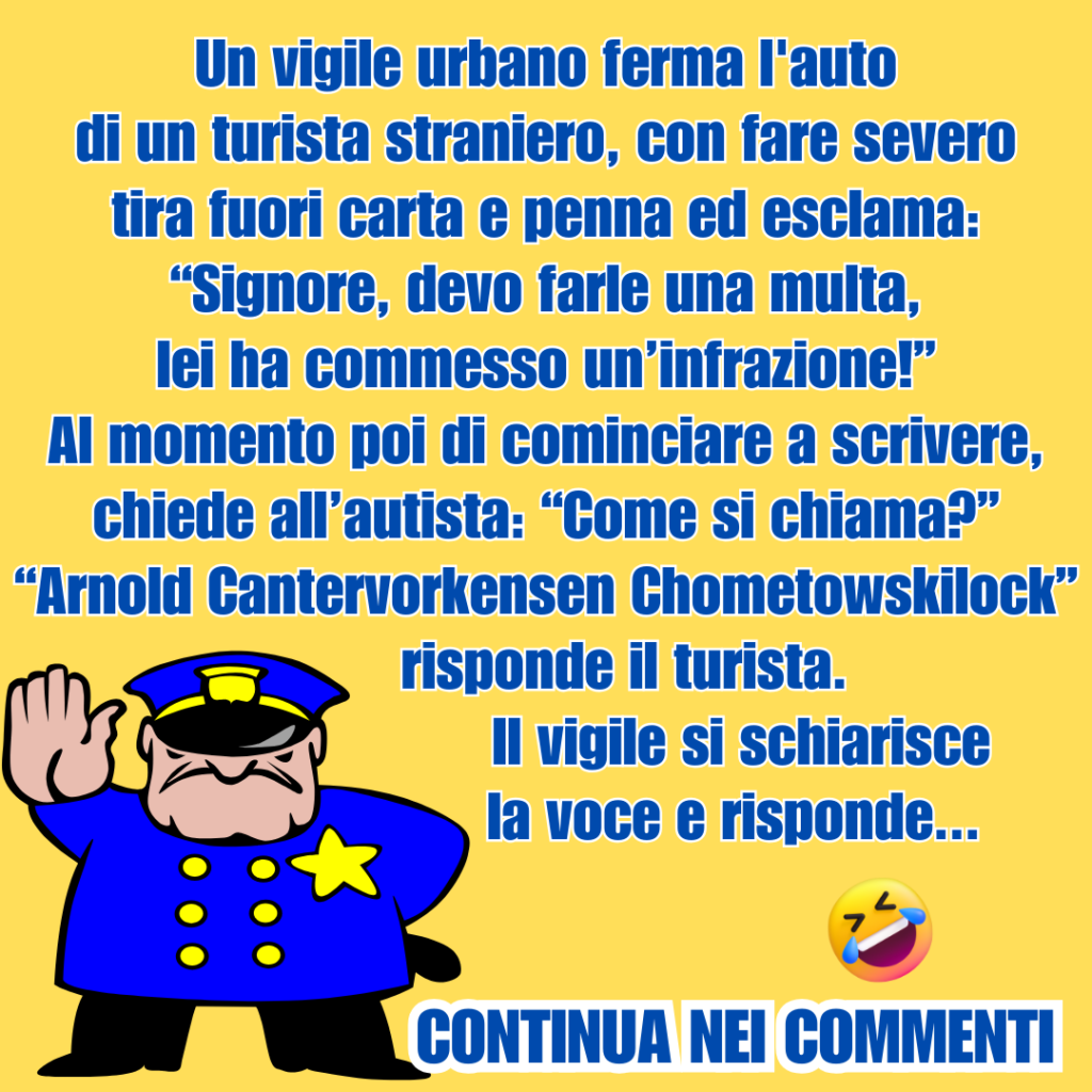 Un vigile urbano ferma l’auto di un turista straniero, con fare severo tira fuori carta e penna ed esclama: “Signore, devo farle una multa, lei ha commesso un’infrazione!”
