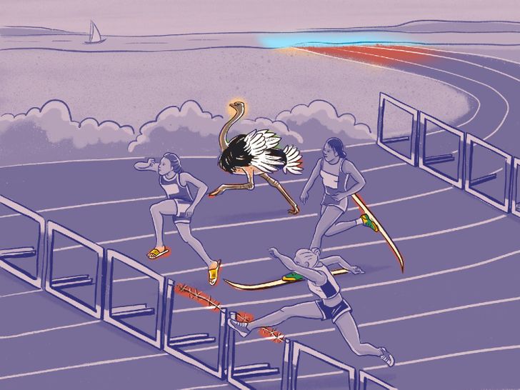 Eccoci tornati con un’immagine davvero enigmatica. Durante una gara di corsa ad ostacoli uno struzzo, davvero fuori luogo, ha deciso di partecipare alla competizione. Tuttavia non è l’unico elemento strano presente in questa immagine. Riesci a vedere gli altri tre? Mi raccomando di prestare attenzione, anche se sono meno evidenti dell’animale, sono dettagli così incredibili da mettere a repentaglio l’intera gara.