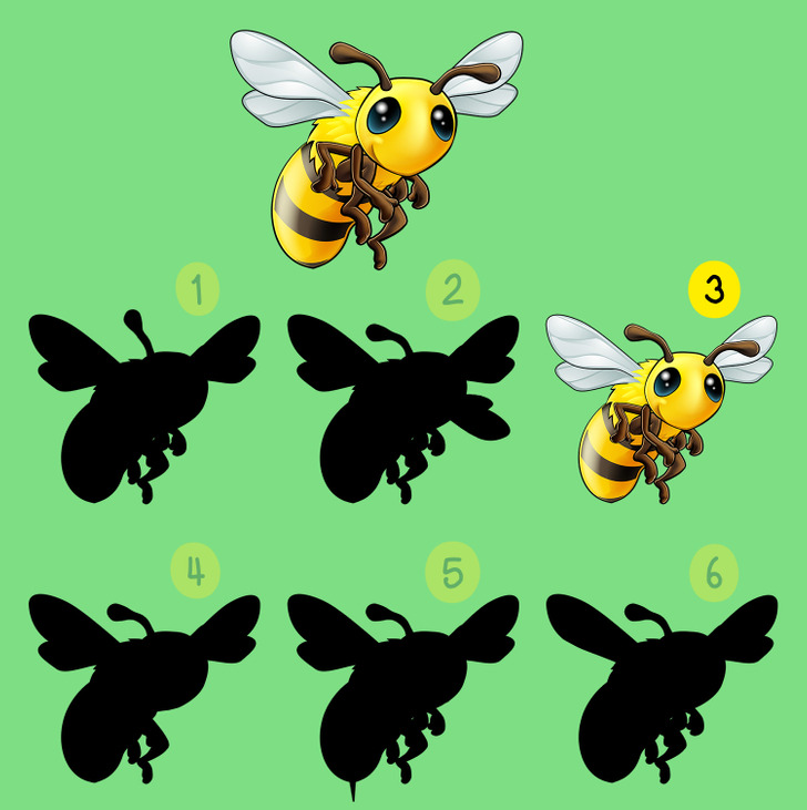 Le ombre proposte sembrano tutte piuttosto simili ma procediamo con l’escludere quelle che certamente non appartengono all’ape. La seconda ombra ad esempio ha un ala di troppo mentre la quinta ha un pungiglione che nell’ape non è presente. Al contrario la quarta ombra manca delle zampe superiori di conseguenza anch’essa non è quella corretta.