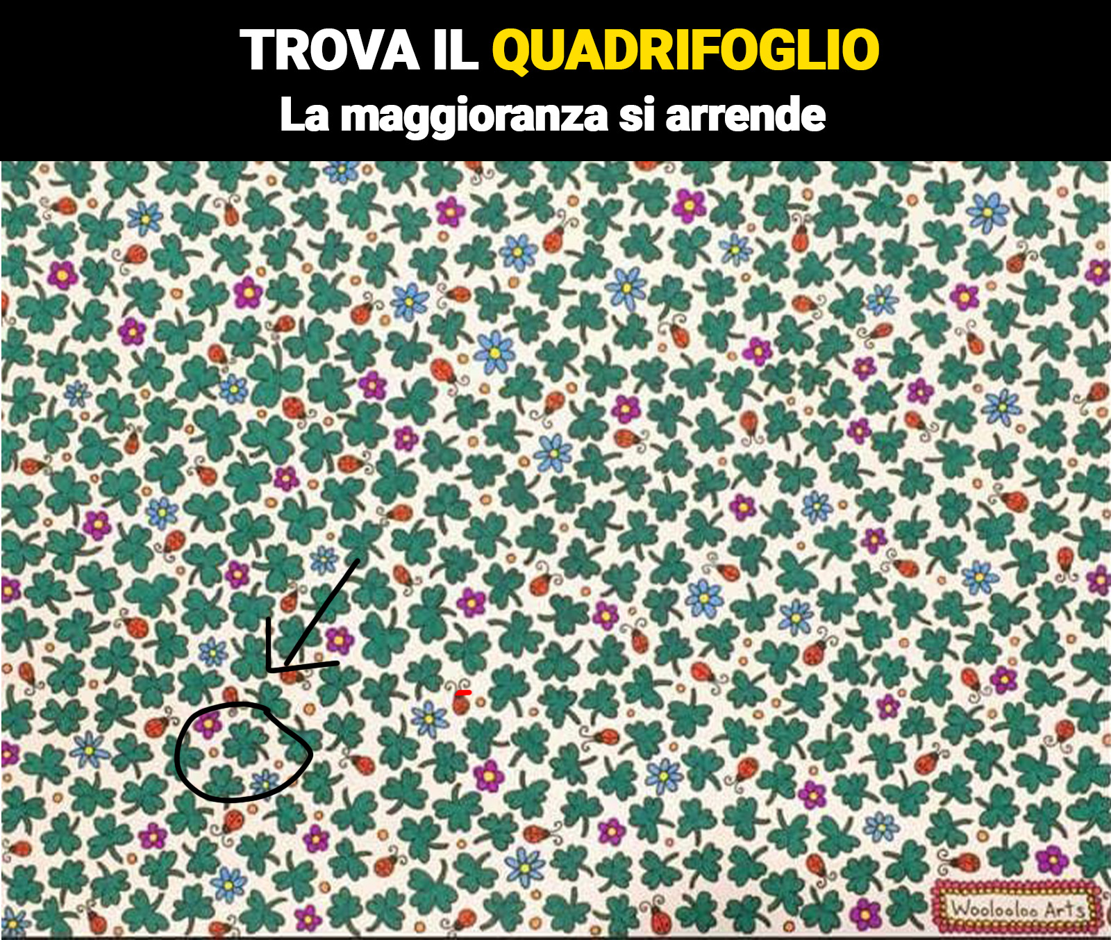Nella parte bassa dell’immagine e, nello specifico, a sinistra è situato il nostro quadrifoglio tanto ricercato. Test di questo tipo sono creati ad hoc per mettere in difficoltà l’osservatore ma, una volta trovato il quadrifoglio, non potrete fare a meno di notarlo e condividere con chi volete questo test. Se ancora non lo avete trovato continuate a scorrere l’articolo per vedere la soluzione.