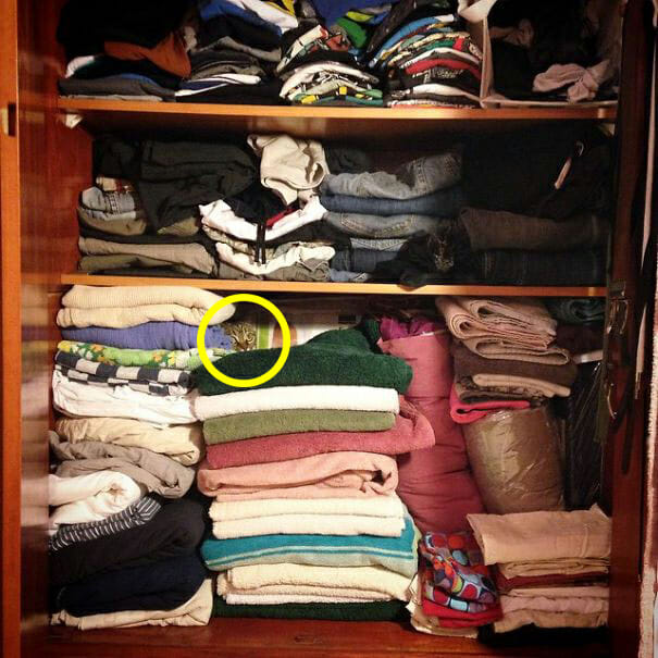 Il protagonista in questione, come spesso accade, è anche stavolta un docile animaletto, che se ne sta tra i panni puliti, passando inosservato, sia al suo stesso padrone, che a no, visitatori eccezionali. Procediamo ingrandendo l’immagine nella zona d’interesse. Riuscite a trovare l’intruso?