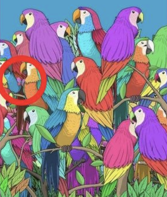 L’intruso protagonista di questo test sembra quasi inesistente, ma c’è! Provate a ragionare in maniera anti-intuitiva: non sprecate il vostro tempo alla ricerca di inutili dettaglia che differenziano un pappagallo dall’altro ma concentratevi sull’immagine nel suo complesso: l’intruso in questione infatti è un insetto.