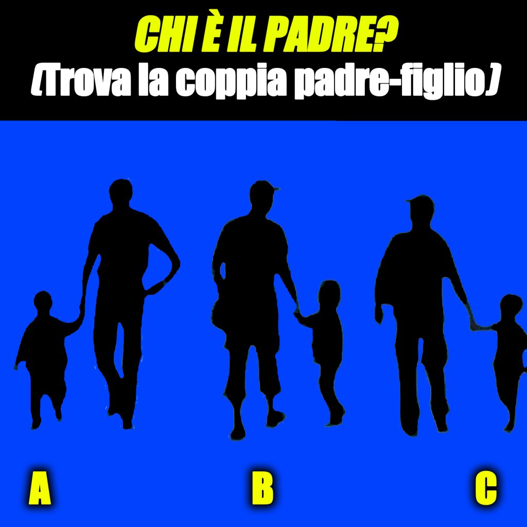 A) Se hai scelto la coppia A non possiamo che farti le nostre congratulazioni. L’uomo raffigurato nella prima coppia, infatti, è il padre del bambino. Un piccolo particolare svela il mistero. Come puoi notare dal disegno, nella prima coppia è l’uomo a tenere il bambino per mano in maniera piuttosto autoritaria e decisa. Nelle altre due coppie, è il bambino a tenere per mano il suo accompagnatore. L’atteggiamento dei piccoli, nelle altre due figure, è poi decisamente più aperto e rilassato: entrambi si rivolgono alla figura che li accompagna! Se hai scelto la figura A sei evidentemente qualcuno che fa molta attenzione ai dettagli; per te non esistono misteri ed hai sempre la situazione sotto controllo. Sei in grado di prendere decisioni ben ponderate e ti capita raramente di fare un passo falso. Complimenti!